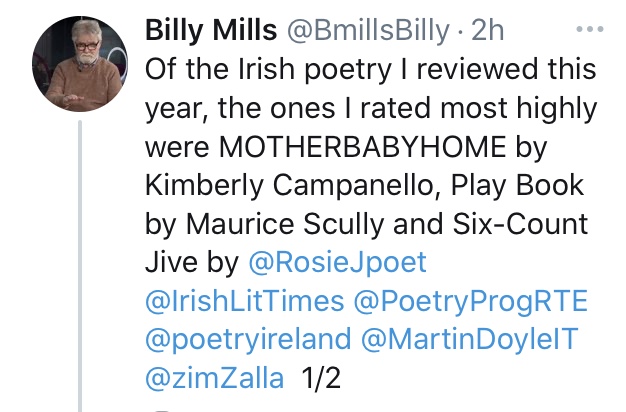 The company I am keeping in this tweet! Billy Mills runs hardPressed poetry with Catherine Walsh and his reviews on his Elliptical Movements website are highly thought of and sensitively written. I am deeply honoured that he has chosen my Lapwing pamphlet Six-Count Jive.