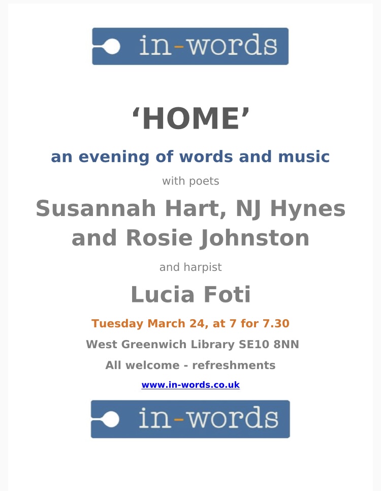 This coming Tuesday 24 March, we’re greeting spring with an evening of poetry in West Greenwich library from 7 for 7.30pm GMT, thanks to marvellous Irena Hill of In-Words. I’m enormously honoured to be reading (from Safe Ground, Mica Press, launched there in April last year) alongside NJ Hynes and Susannah Hart, with music by harpist Lucia Foti. We’ll be focussed on home and where we find it, with wine, Irena’s home-made cakes and the best of company.