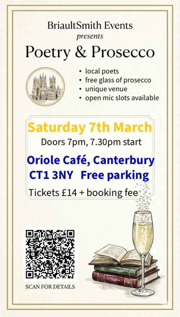 On Saturday 7 March, 2026, 7.30 – 10pm, Sarah Briault is bringing POETRY & PROSECCO to north Kent again for another ‘fun, bubbly evening’ and I’m really excited to be among the featured poets. Your ticket price includes a glass of Prosecco or non-alcoholic drink, and the chance to read your own words in the open mic. More details tbc.